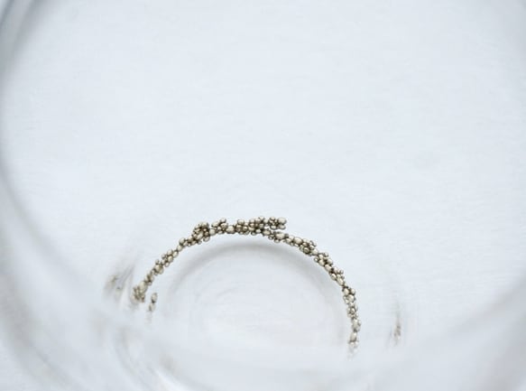 硝子の中に真鍮を入れ込むと、硝子よりも融点が低い真鍮は液状化し中で発泡したまま留まります。